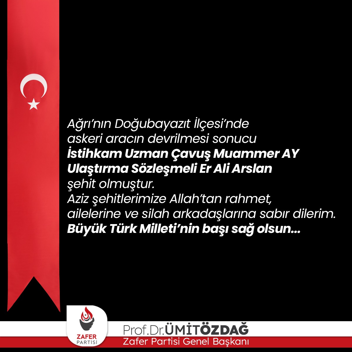 Ağrı’nın Doğubayazıt İlçesi’nde askeri aracın devrilmesi sonucu İstihkam Uzman Çavuş Muammer AY ve Ulaştırma Sözleşmeli Er Ali Arslan şehit olmuştur. Aziz şehitlerimize Allah’tan rahmet, ailelerine ve silah arkadaşlarına sabır dilerim. Büyük Türk Milleti’nin başı sağ olsun...
